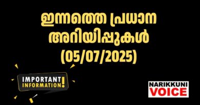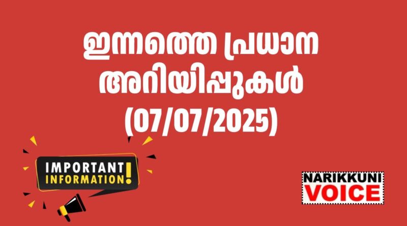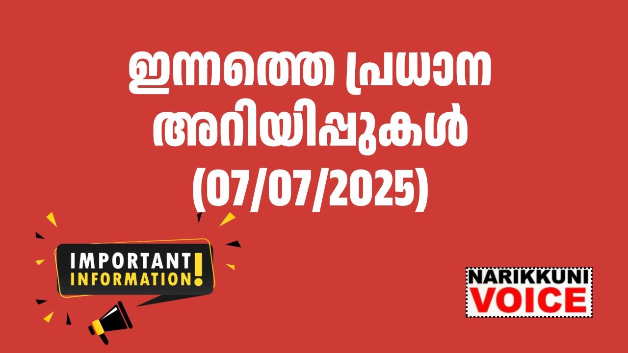ഇന്നത്തെ പ്രധാന അറിയിപ്പുകൾ (07/07/2025)