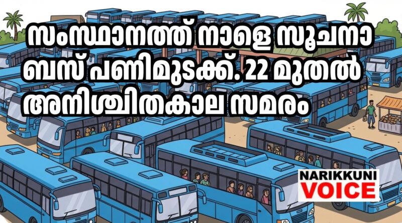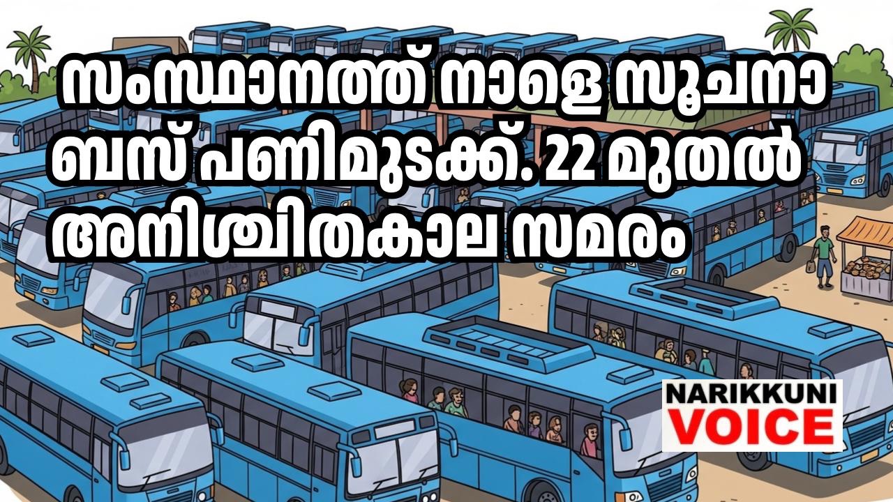 സംസ്ഥാനത്ത് നാളെ സൂചനാ ബസ് പണിമുടക്ക്. 22 മുതൽ അനിശ്ചിതകാല സമരം